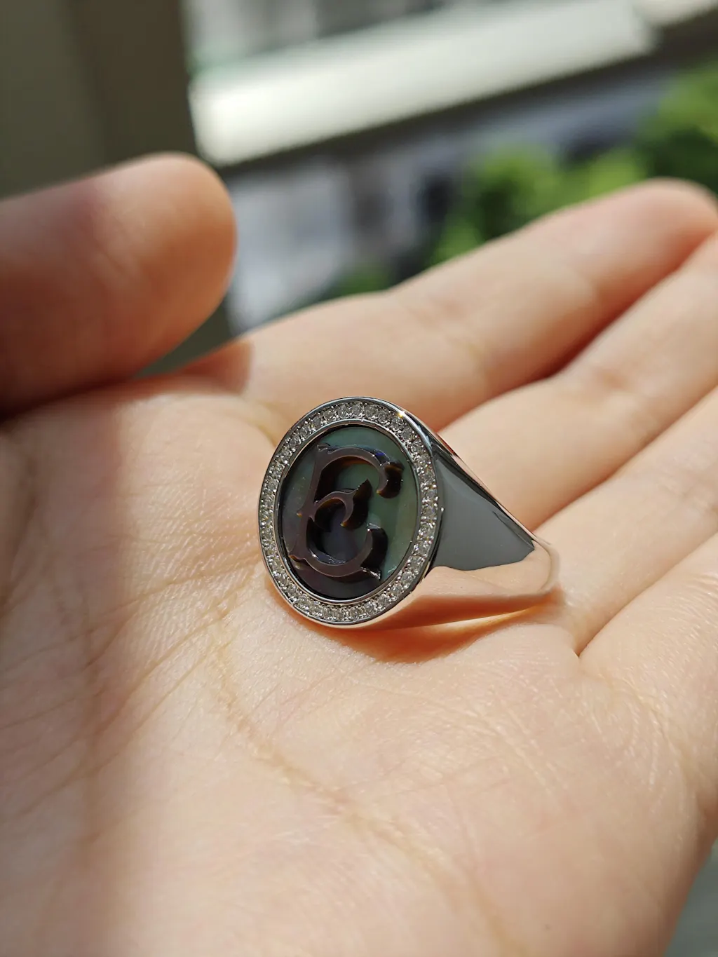 Channel vital energy with the Initial D ring. The iridescent Black Mother of Pearl in sterling silver with a lab diamond reflects strength and life flow.