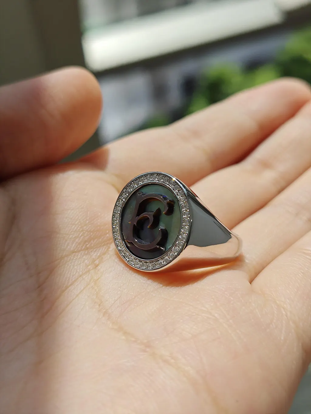 No two black mother of pearl inlays are exactly the same. The surface shimmers in soft hues of grey, green, and blue, offering a natural glow that symbolizes intuition, transformation, and inner peace. Paired with lab-created diamonds and white gold–plated S925 silver, it’s the perfect harmony of boldness and delicacy.