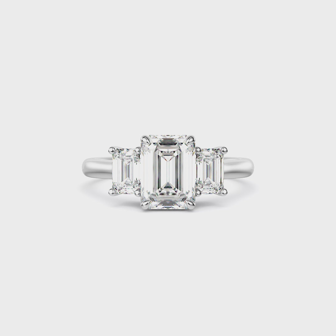 Sophisticated and striking, the Emerald-Cut Three-Stone Lab Diamond Engagement Ring is a modern classic. The step-cut emerald center stone exudes timeless elegance, flanked by two matching emerald-cut side stones that enhance its symmetry and brilliance. Set on a smooth, polished band, this design celebrates both refined geometry and sustainable craftsmanship. A perfect choice for those who love understated luxury.