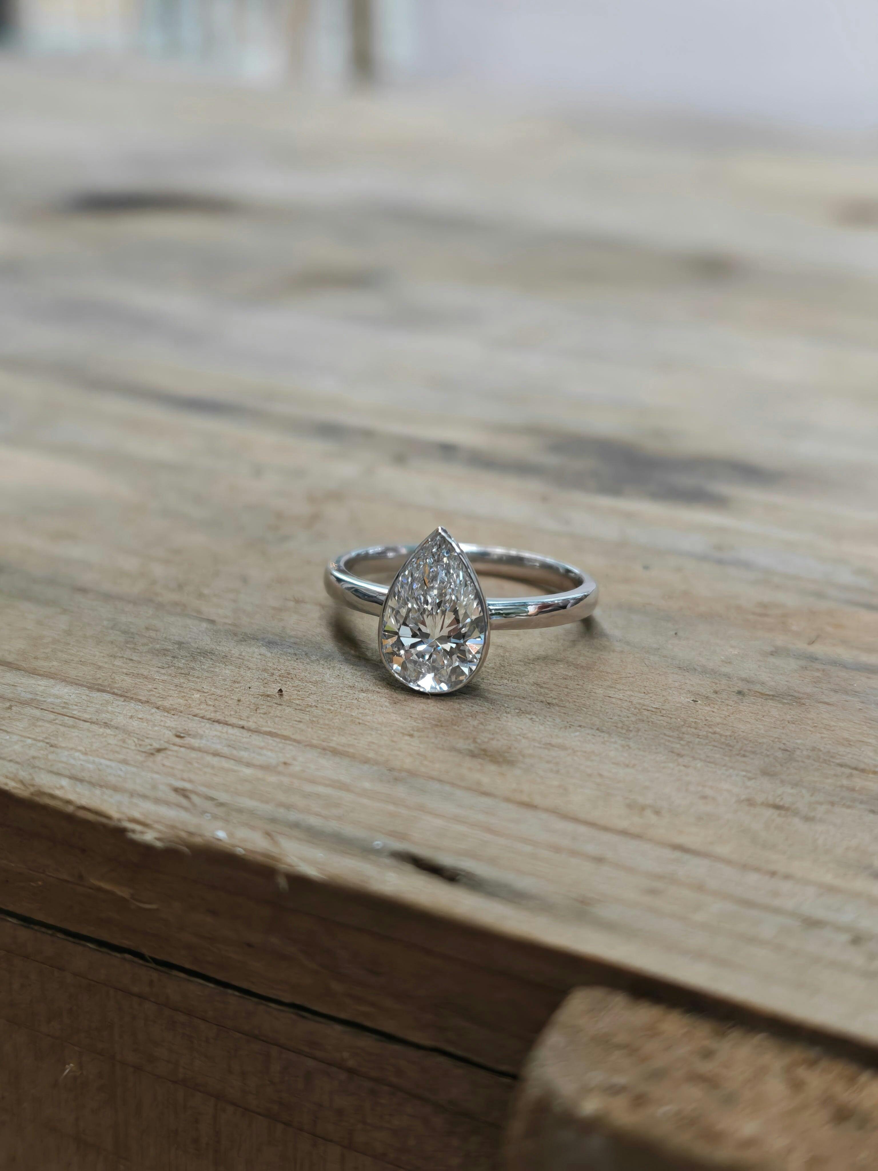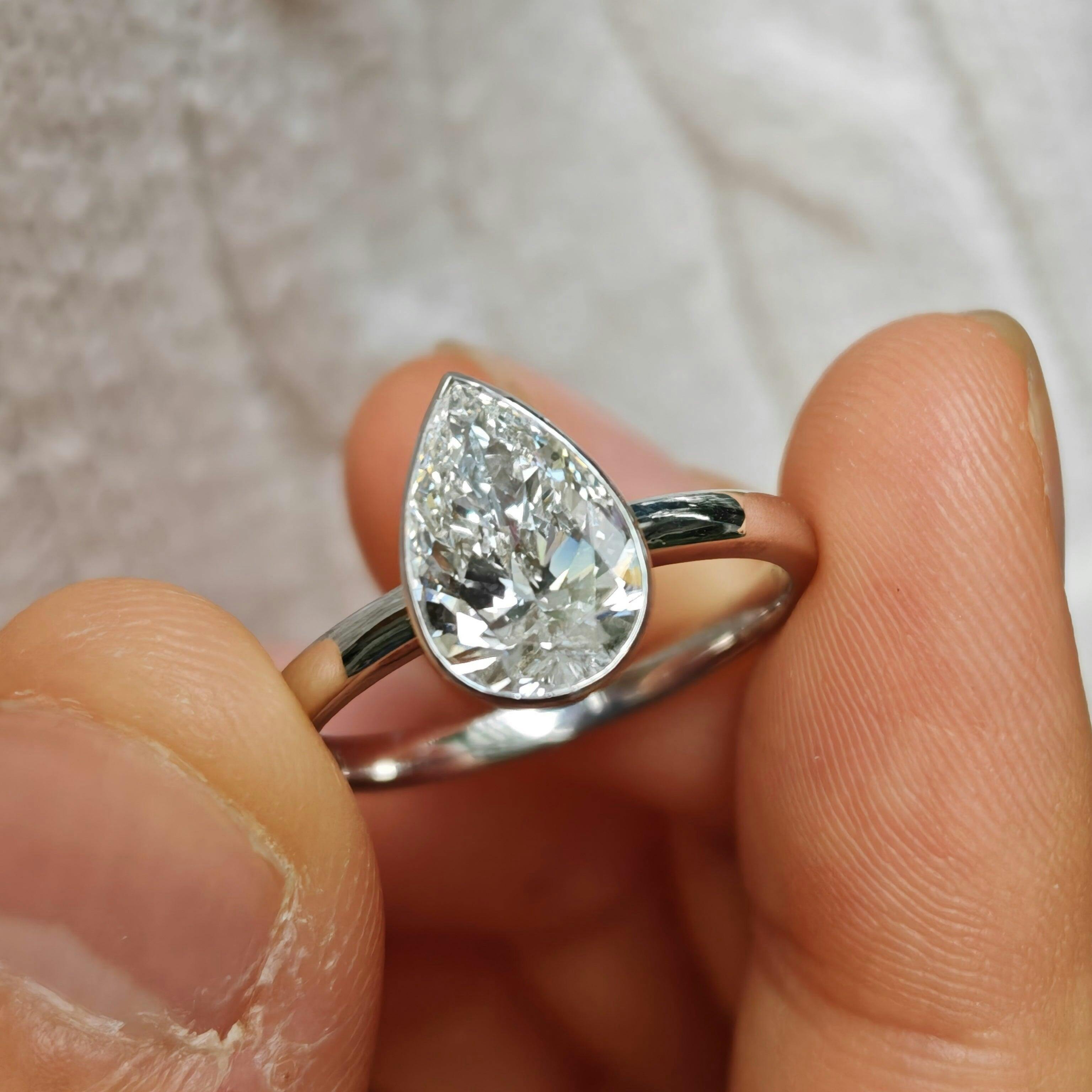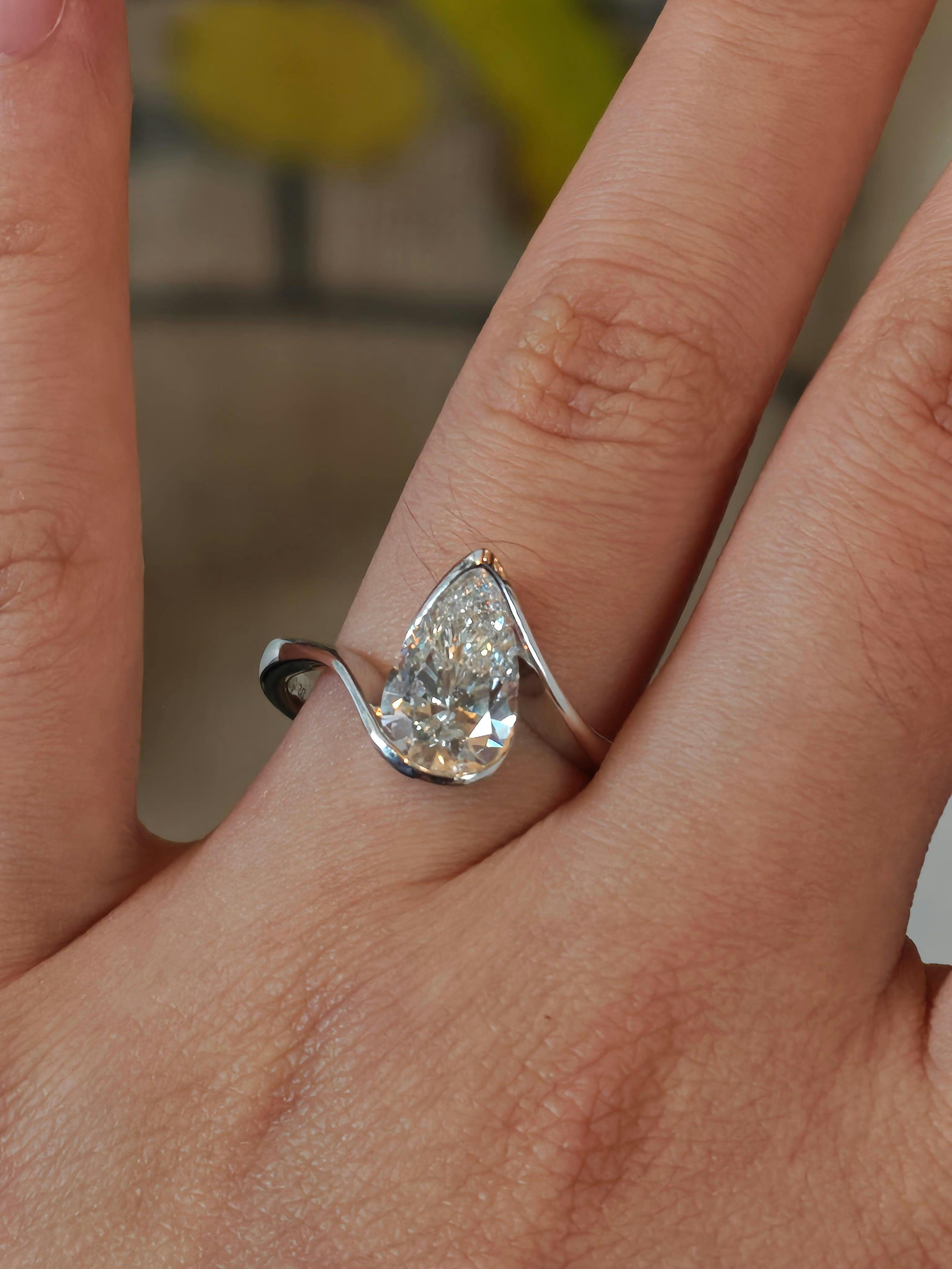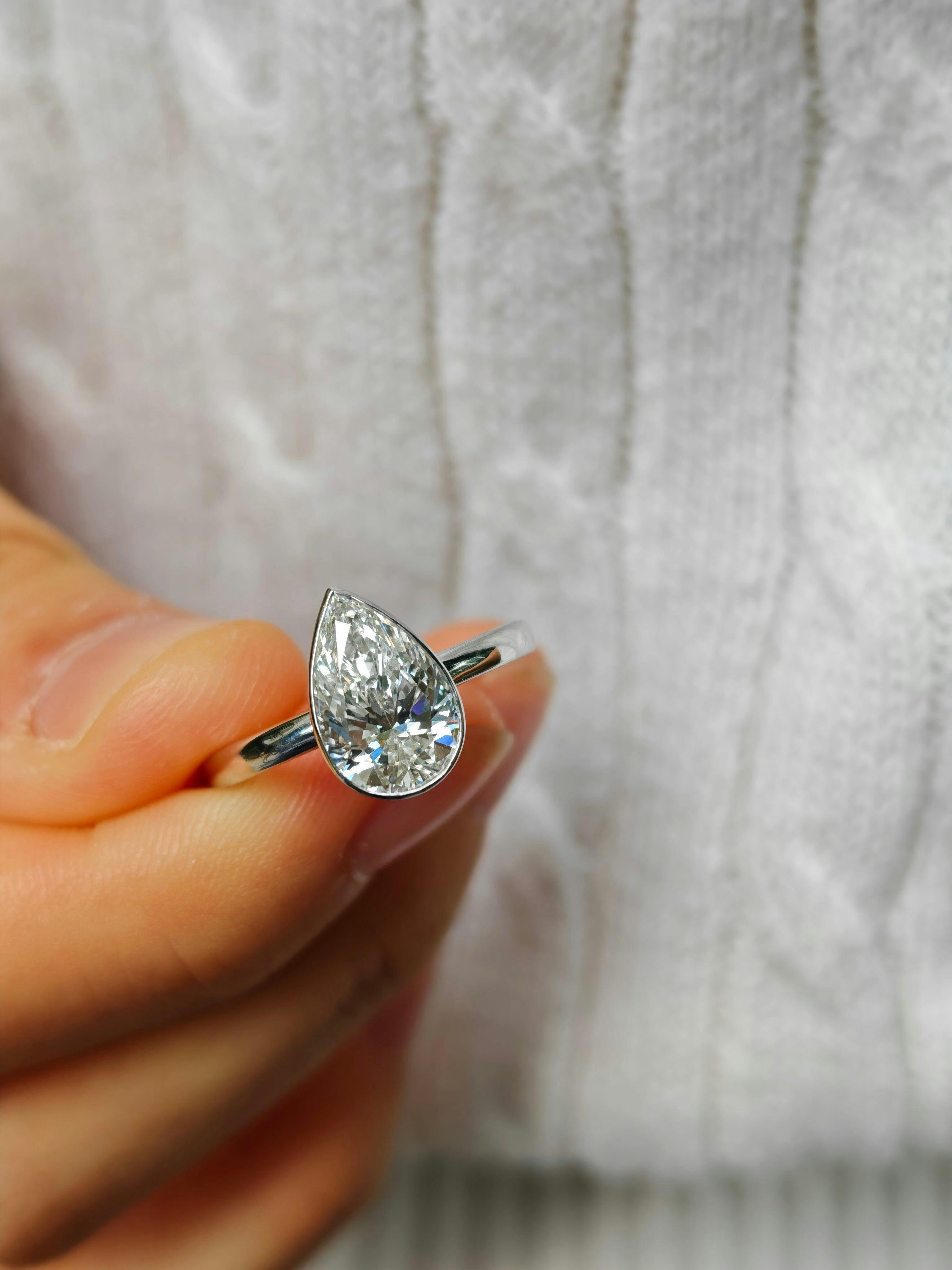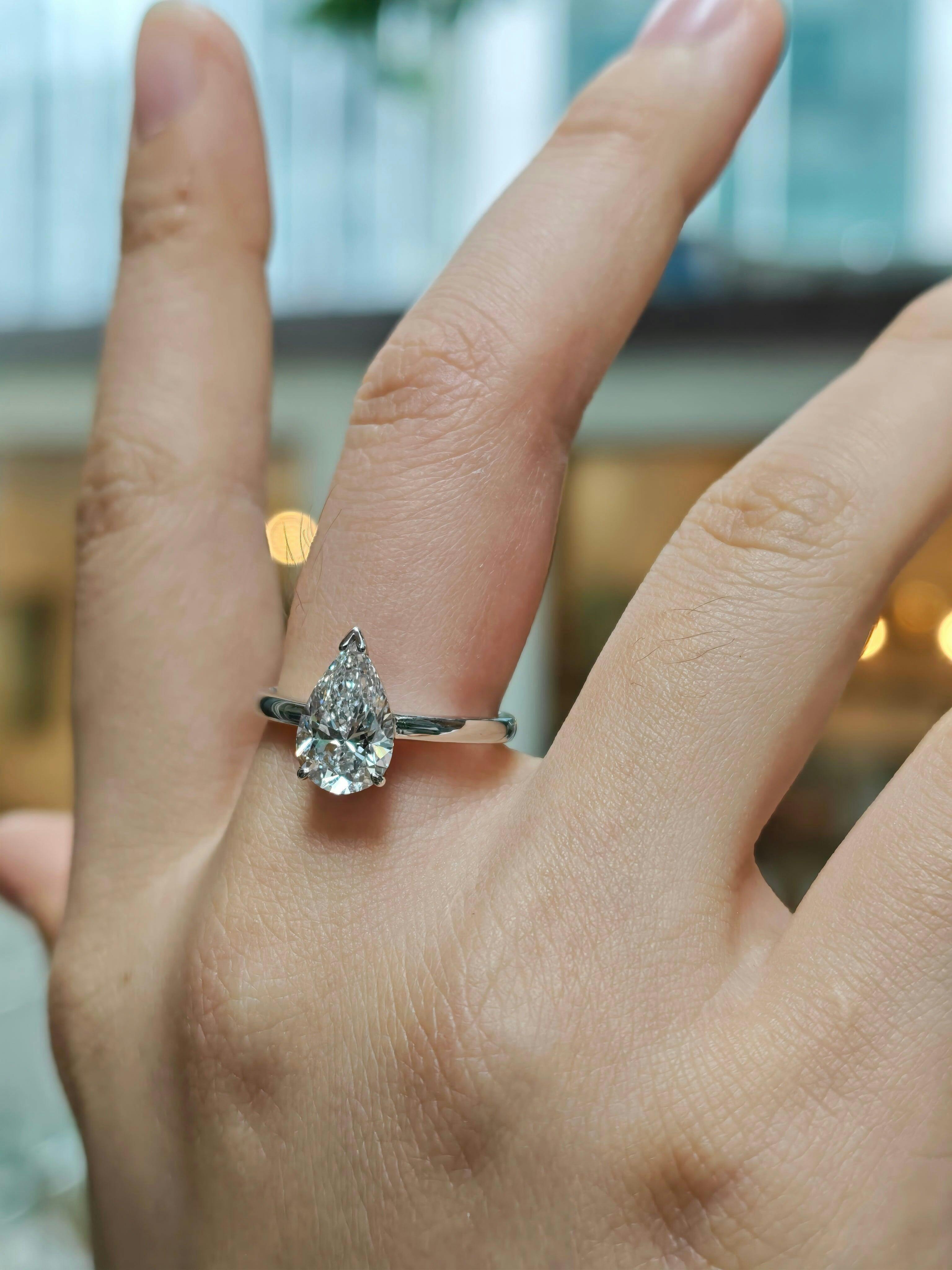 The Pear-Cut Three-Stone Lab Diamond Engagement Ring offers a romantic twist on a classic. A teardrop-shaped center stone is flanked by two matching pear-cut diamonds, creating a graceful, elongated look on the finger.